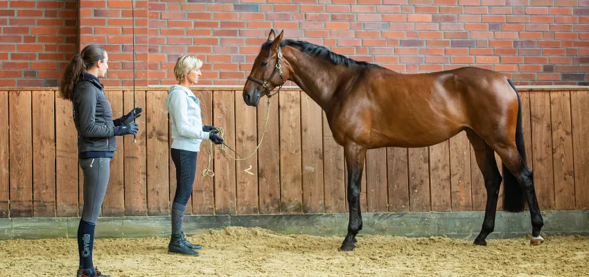 In der Übung soll dein Pferd rückwärtstreten, allerdings ohne jeglichen Kraftaufwand von deiner Seite aus. Dazu stehst du vor deinem Pferd und legst deine Hand auf seine Nase.