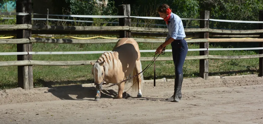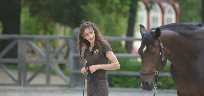 Lisa Röckener startet zu Anfang mit der Konditionierung des Pferdes auf bestimmte Wörter, Laute und Tonfälle, denn Pferde sind tatsächlich fähig, diese ganz genau zu unterschieden. Erst sobald darauf eine Reaktion folgt, wird Neues hinzugenommen: So ist das Rückwärtsgehen ohne Körpersprache, nur mit der Stimme, eine der ersten Übungen. Danach wird der Fokus auf die Körpersprache gelegt mit dem Ziel das Pferd nur mit der Körperhaltung in eine Volte einzuladen. Aber Schritt für Schritt.